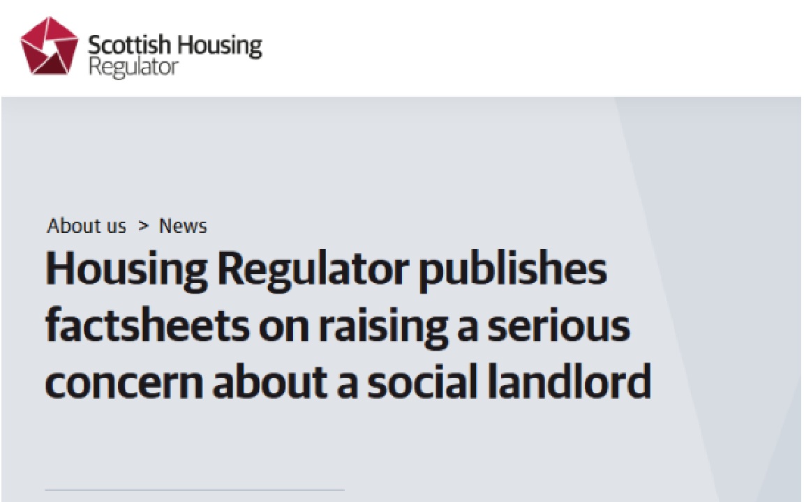 More information can be found at the following link Housing Regulator publishes factsheets on raising a serious concern about a social landlord | Scott… and the 'Complaints and Serious Concerns about Landlords' factsheet can also be viewed under our Policies and Documents section